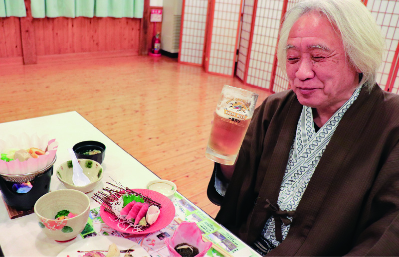 部屋に荷物を置いたら、まずはロビーでお茶代わりの缶ビールを一本。つまみは売店で購入した乾きもの。夕食時の本番に備えて軽くのどを潤し、小腹を満たしておくのが、のん兵衛の心得だ。理由はそれだけではない。これからの入浴での発汗に備えての水分補給も兼ねているのだ。