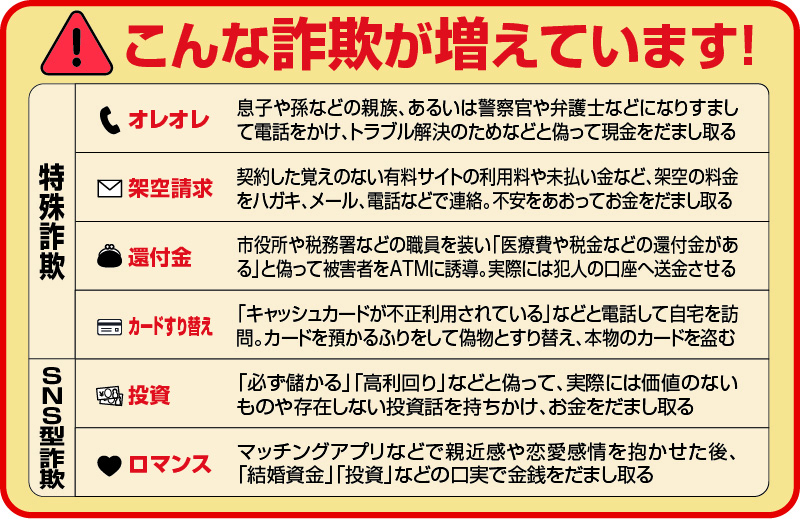 中でも多いのがオレオレ詐欺。特徴は「オレ」と子どもや孫を装うのではなく、警察官役や検事役などが次々に登場する劇場型で、さまざまな名乗り方がある。