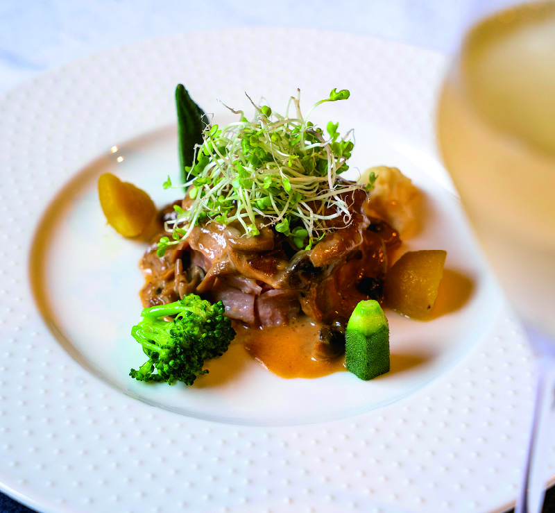メインは豚フィレ肉のポワレ。厚みがあるのに箸で切れるほど柔らかい。数種類のキノコのクリームソースがとろりとかかり、秋の森を歩いているような気分に。