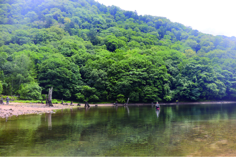 <沢を行き尽くすと其処に端然として澄み湛えた一つの沼があった。岸から直ちに底知れぬ蒼みを宿して、屈折深い山から山の根を浸している。三つ続いた火山湖のうちの大尻沼がそれであった。>