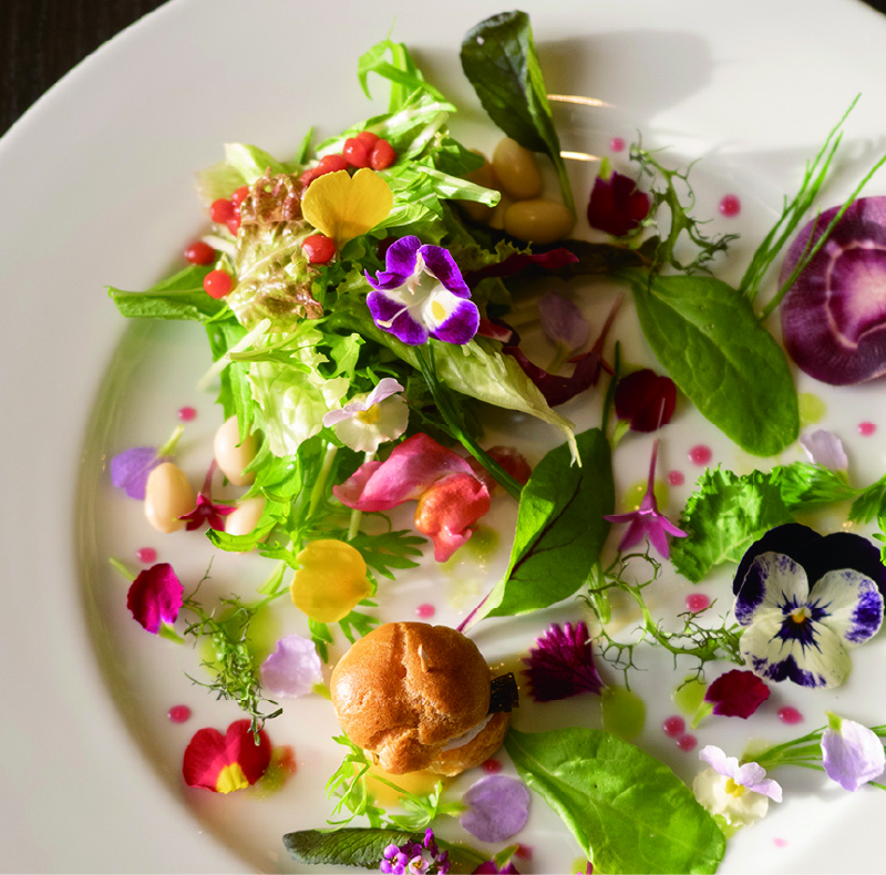 最初に運ばれてきたのは「宝石箱サラダ」。白い大皿に、無農薬のエディブルフラワーと野菜が鮮やかに配置され、思わず心の中で歓声を上げる。自家製ポンズとフレンチを合わせた和風仕立てのドレッシングで、あと味はすっと軽い。