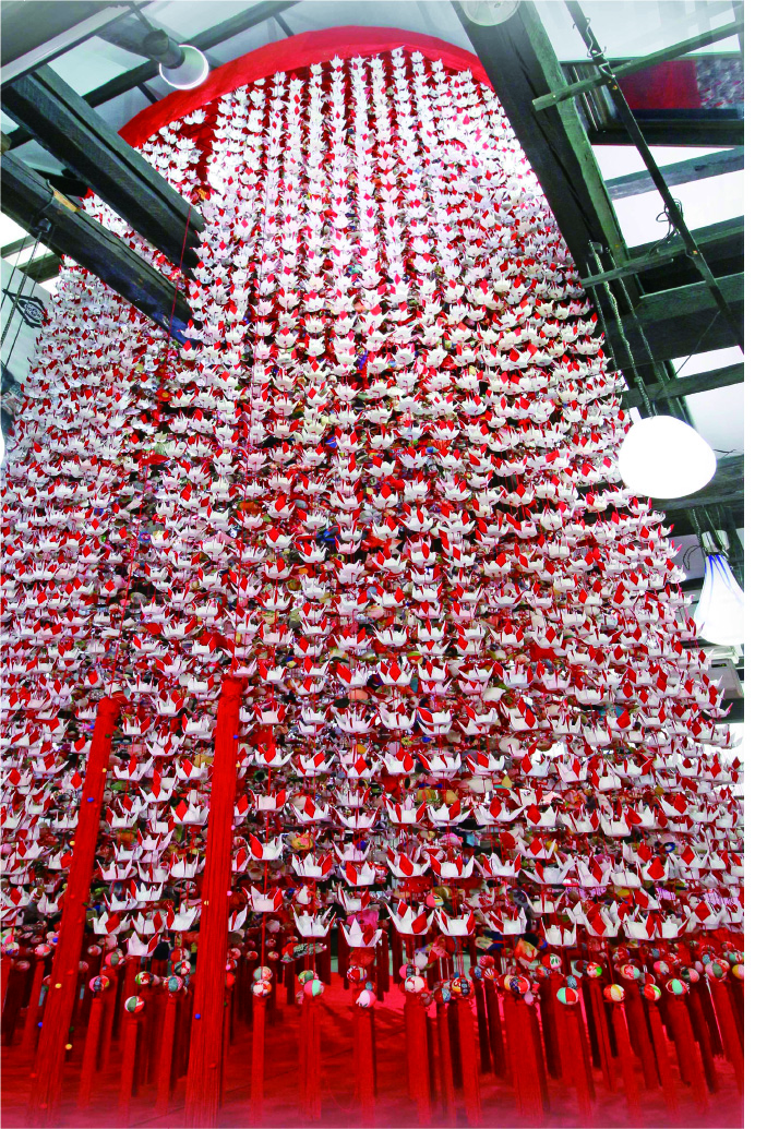 店内に足を踏み入れた瞬間、目の前に広がる光景に誰もが息を飲む。天井から降り注ぐように飾られているのは、ギネス世界記録に認定された世界一のつるし飾りだ。紅白のツルが外側を彩り、内側は色とりどりの金魚、俵、カメといった縁起物がまるで万華鏡のように煌めく。