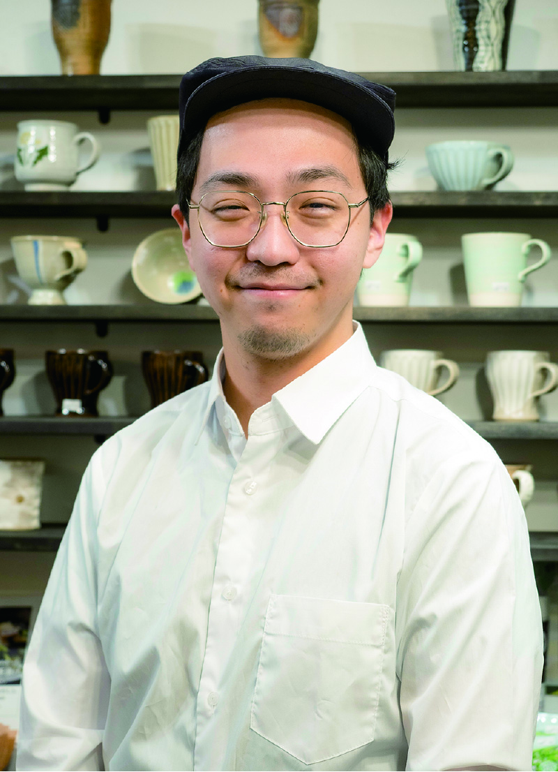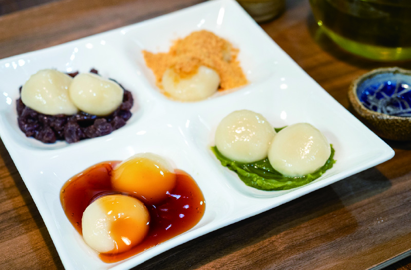 デザートは「彩り白玉」を、県産の桑茶と共に頼んだ。なめらかな絹ごし豆腐と国産白玉粉を合わせた白玉を温め、熱々を4種類の味で楽しむ。宇治抹茶あん、北海道産小豆の自家製粒あん、みたらし、きなこ。つるりとした口当たりで、やさしい甘さが広がる。「豆腐を使う分、普通の白玉より低カロリーでヘルシーなんですよ」と店長の鈴村佑介さん。