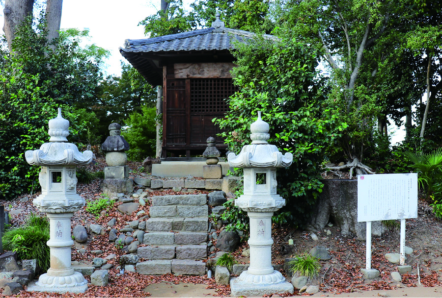 続いては境内の墓地の近く、1号墳と本堂の中間に大師堂が建っている。石塔が左右に並び、その間に石段が数段あり、小さな高まりの上にお堂が鎮座している。この高まりこそが慈眼寺2号墳である。またの名を大師堂古墳とも呼ばれている。直径約10メートル、高さ約1・5メートルの円墳だ。石段の周囲にゴロゴロと散乱している石の存在が気になった。