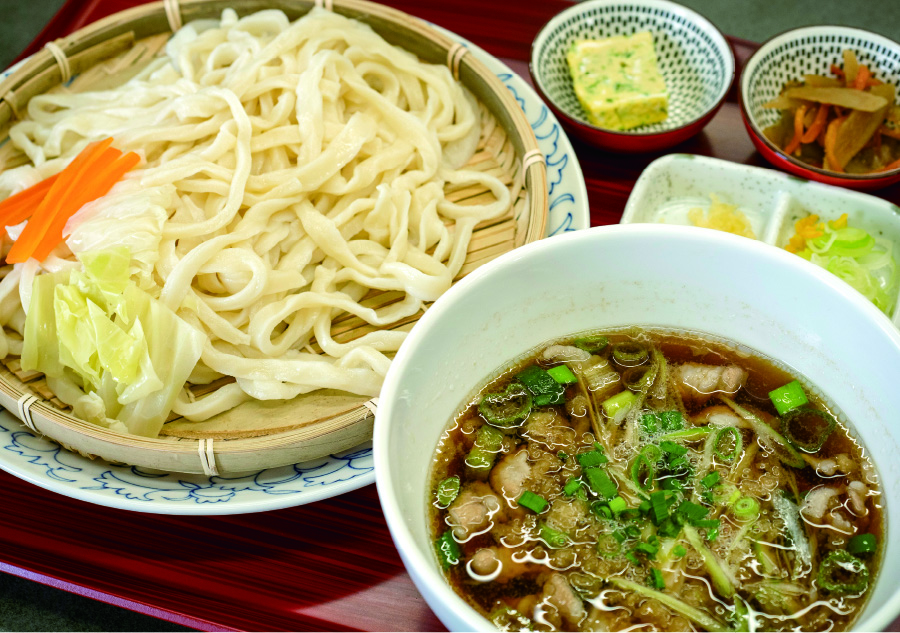 祖父の味を再現した看板の肉汁うどんは、甘じょっぱいつけ汁に豚バラ肉が入り、400gのざるうどんを豪快にすすれる一杯。