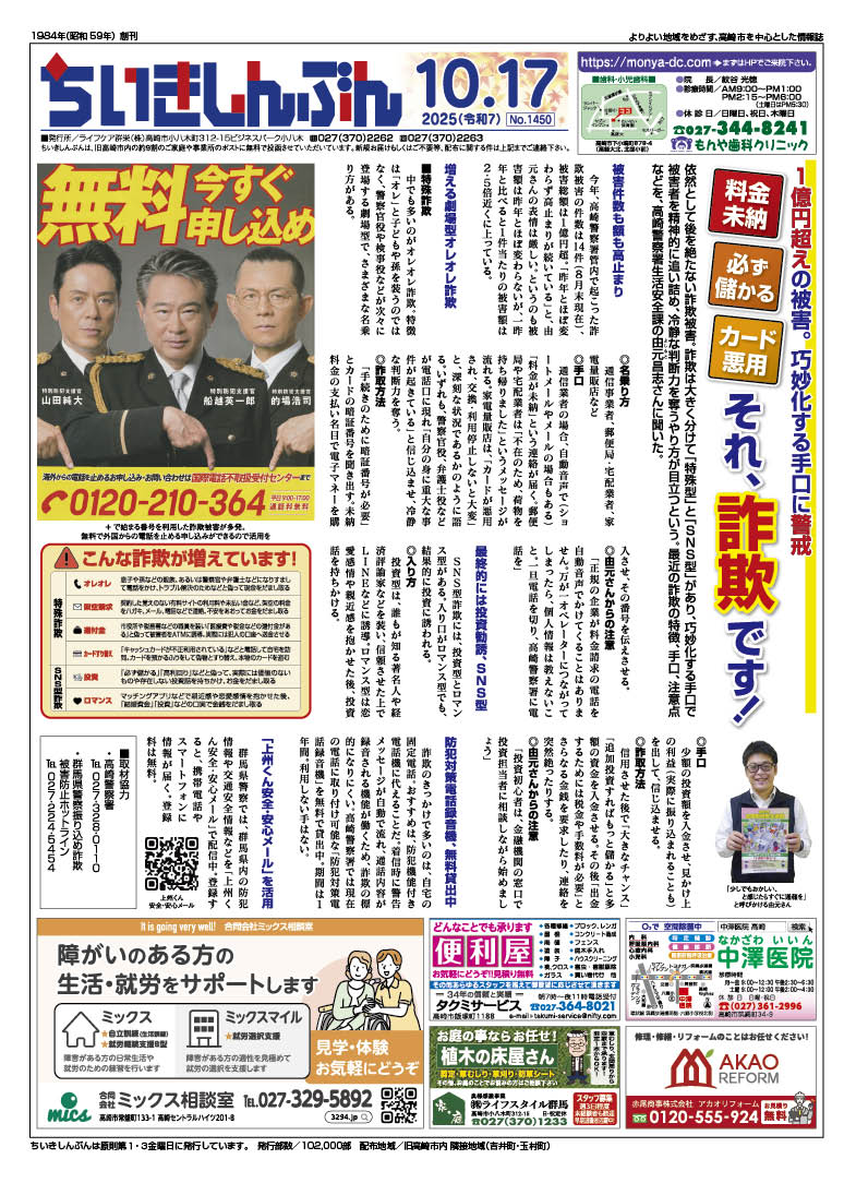 バックナンバー 2025年10月17日号 2025 10/14 バックナンバー 2025年10月17日 URLをコピーしました! 目次1面 紙面の画像はPDF版とリンクしています。 2面 紙面の画像はPDF版とリンクしています。 3面 紙面の画像はPDF版とリンクしています。 4面 紙面の画像はPDF版とリンクしています。 バックナンバー よかったらシェアしてね! URLをコピーしました! URLをコピーしました! バックナンバー 2025年10月10日号 1億円超えの被害。 巧妙化する手口に警戒 「料金未納」「必ず儲かる」「カード悪用」それ、詐欺です! 2025年10月17日号 おすすめ記事 バックナンバー 2025年10月10日号 2025年10月10日 バックナンバー 2025年10月03日号 2025年10月3日 バックナンバー 2025年09月19日号 2025年9月19日 バックナンバー 2025年09月12日号 2025年9月12日 バックナンバー 2025年09月05日号 2025年9月5日 バックナンバー 2025年08月22日号 2025年8月22日 バックナンバー 2025年08月08日号 2025年8月8日 バックナンバー 2025年08月01日号 2025年8月1日
